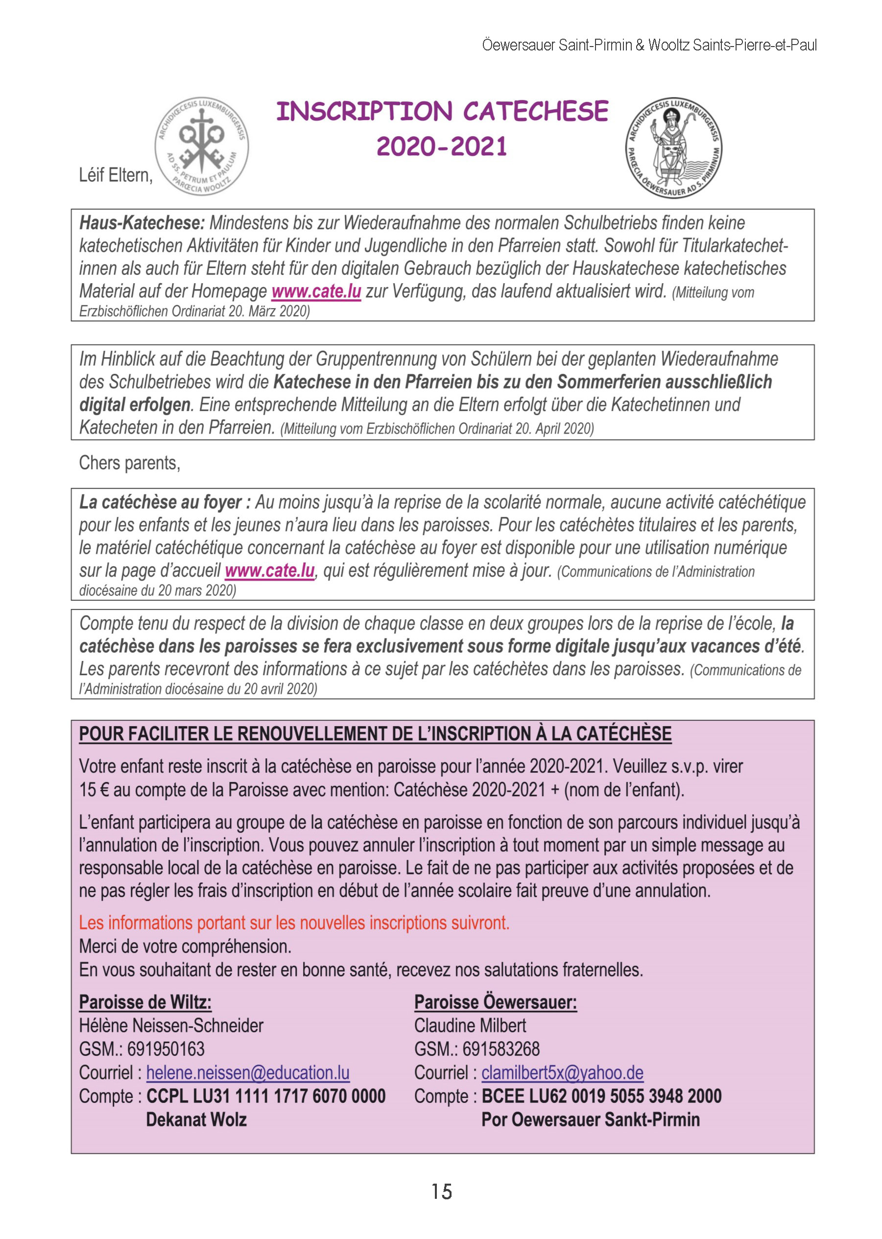 Inscription Catéchèse 2020-2021
